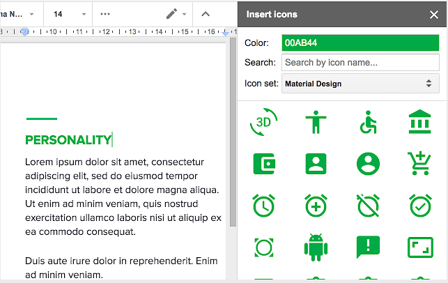 Une des raisons pour lesquelles les gens veulent des polices personnalisées est que de nombreuses polices ont des caractères spéciaux qui peuvent être utilisés dans les documents. Ce module complémentaire évite ce genre de solution maladroite. Au lieu de cela, il vous permet d’importer directement tous les caractères spéciaux que vous voulez. Icons for Docs vous permet d’importer plus de 900 icônes de Font Awesome et 900 icônes de Google Material Design, de changer leur couleur et de les redimensionner directement dans le document.