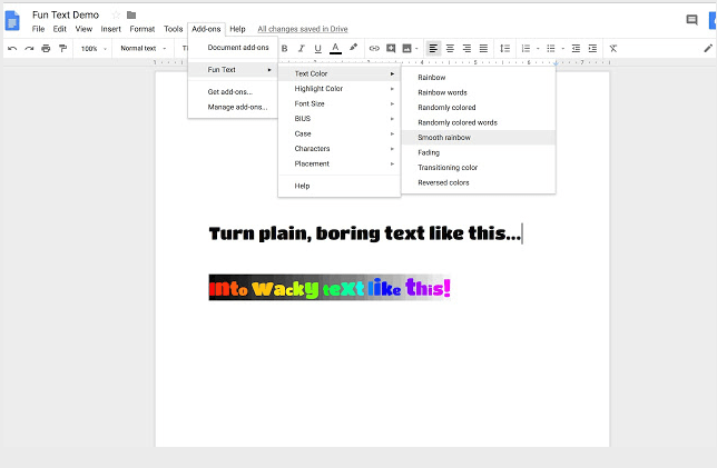 Fun Text est un module complémentaire qui vous permet d’ajouter toutes sortes d’effets visuels à votre texte, notamment des arcs-en-ciel, des couleurs aléatoires, des fondus et bien plus encore. Vous pouvez faire grandir vos lettres, les retourner… c’est vraiment très, très amusant.