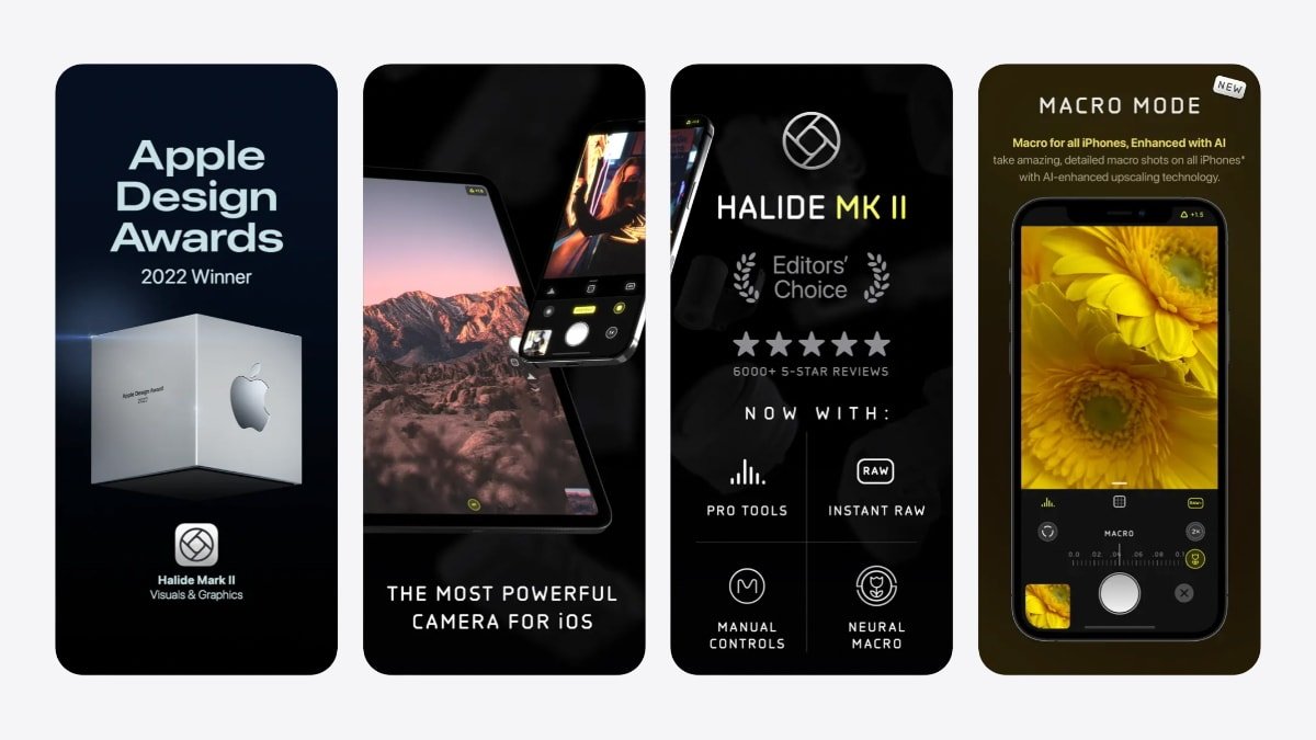 Halide, App Store’daki en popüler kamera uygulamalarından biridir. Pozlama, ISO, deklanşör hızı ve beyaz dengesinin ayarlanması gibi bir fotoğrafçının isteyebileceği tüm manuel kontrolleri sunar. Görüntü formatları için destek RAW (DNG RAW), TIFF, HEIC ve JPG’yi içerir.